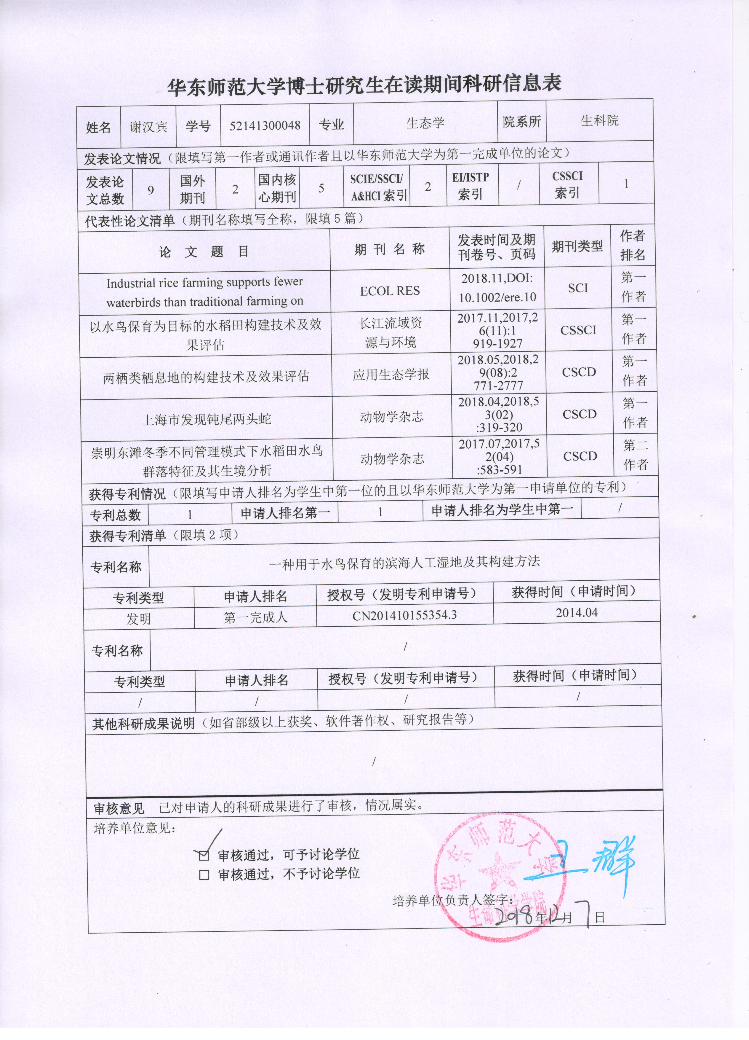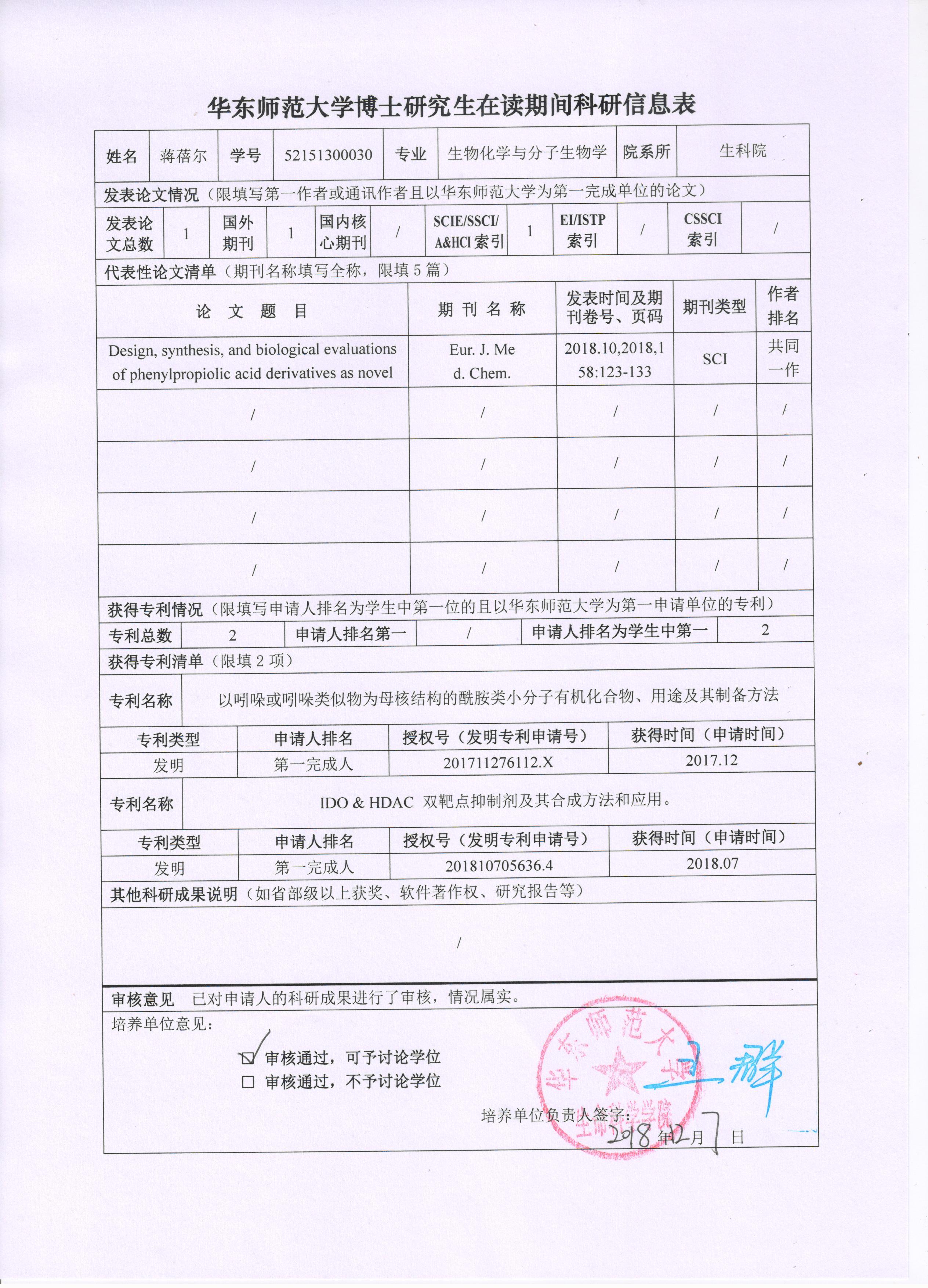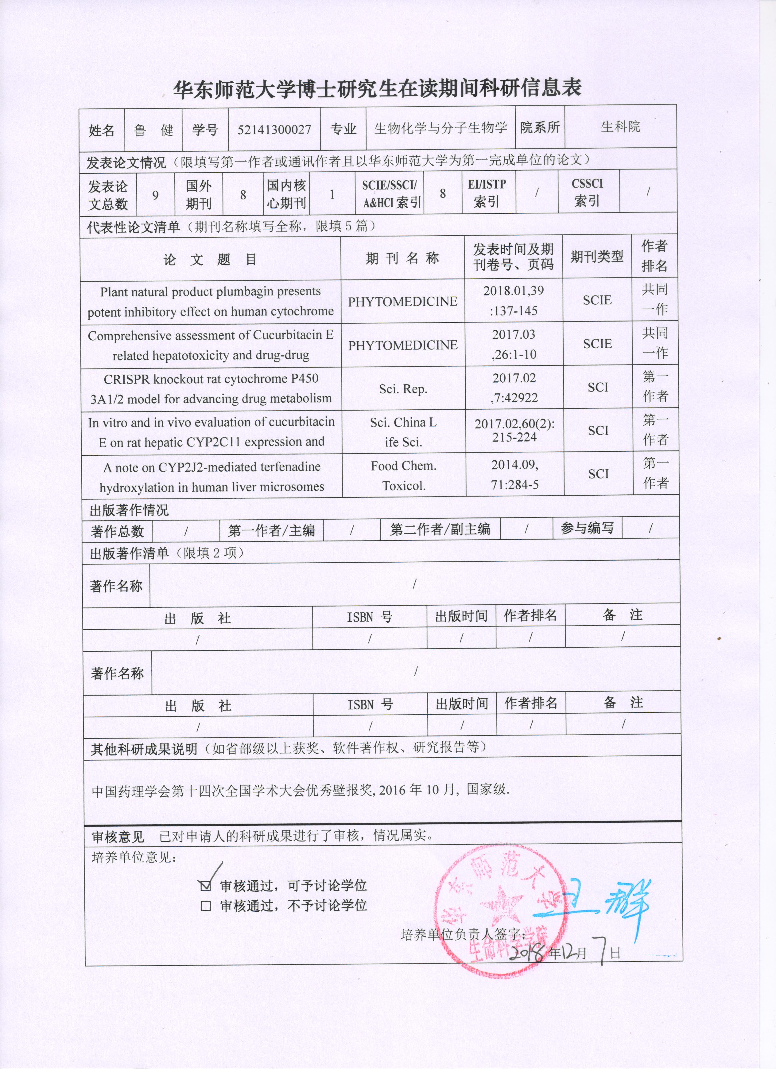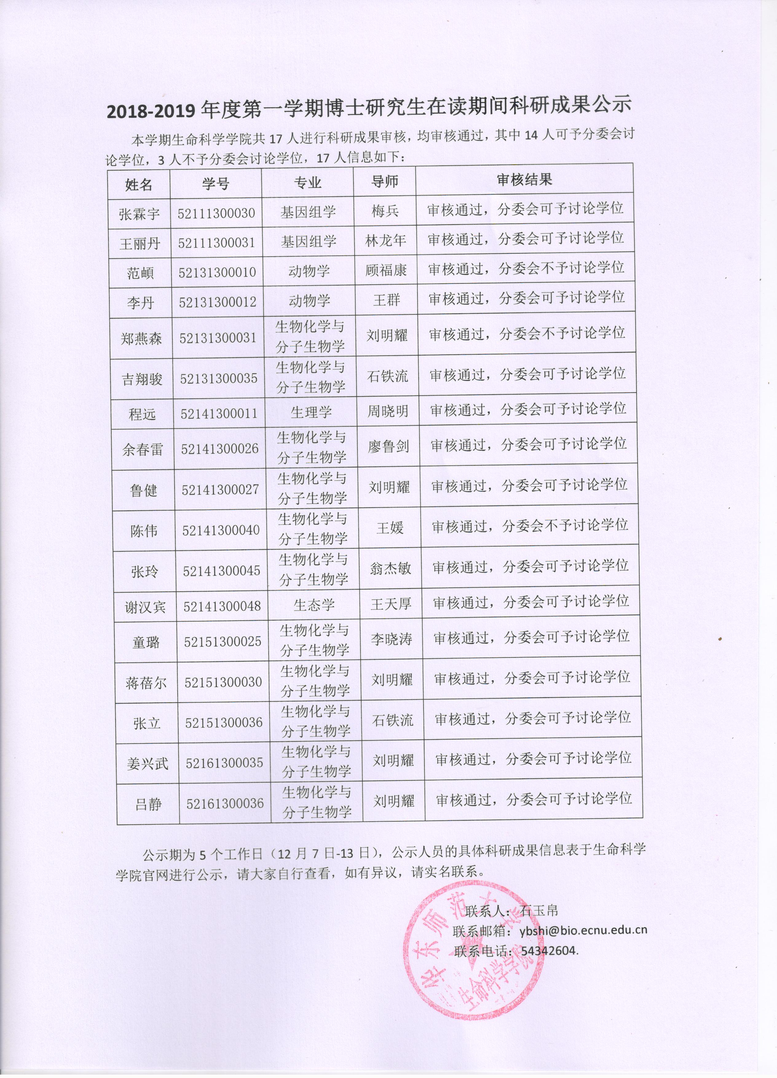 2018-2019年度第一学期博士研究生在读期间科研成果公示