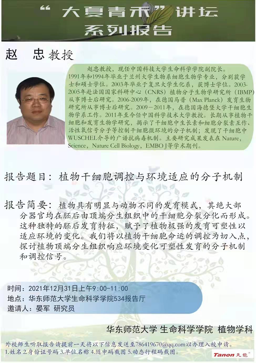 赵忠教授,现任中国科技大学3200威尼斯vip副院长,1991年和1994年毕业于兰州大学生物系细胞生物学专业,分别获学士和硕士学位。2003年毕业于复旦大学生化系,获博士学位。2003-2005年赴法国国家科研中心(CNRS)植物分子生物学研究所(IBMP)从事博士后研究。2006-2009年,在德国马普(Max Planck)发育生物研究所从事博士后研究。2009-2011年,在德国海德堡大学干细胞生物学系工作。2011年至今任中国科学技术大学教授。长期从事植物干细胞和发育生物学研究,揭示了干细胞中生长素和细胞分裂素互作、活性氧信号分子等控制干细胞微环境的分子机制;发现了干细胞中WUSCHEL介导的广谱抗病毒机制。主要研究成果发表在 Nature,Science,Nature Cell Biology,EMBO J等学术期刊。