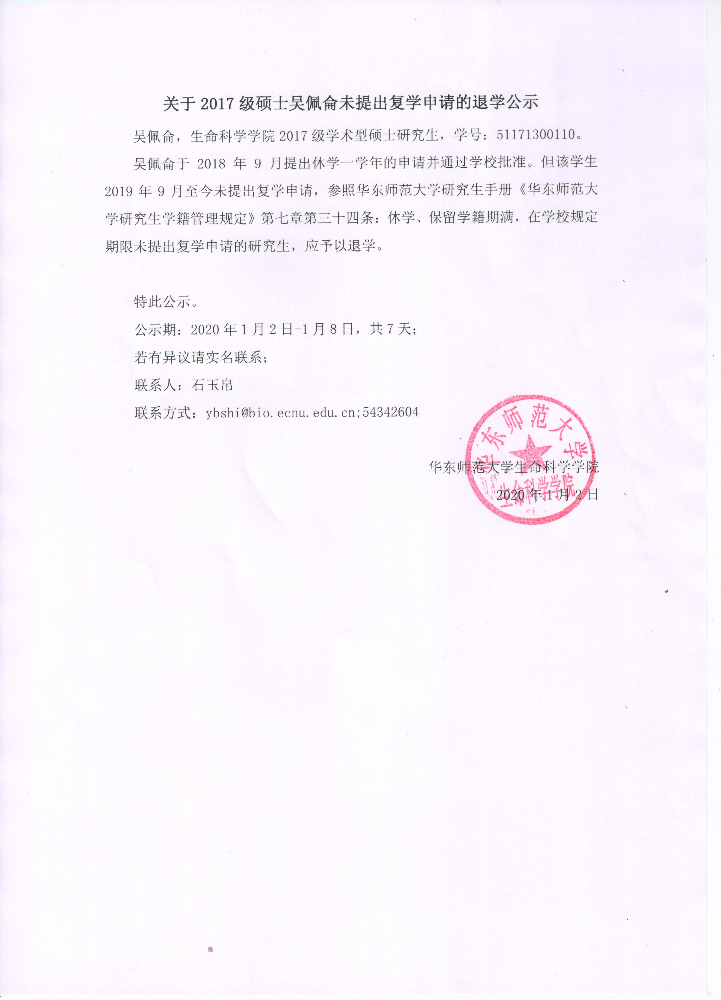 关于2017级硕士吴佩侖未提出复学申请的退学公示