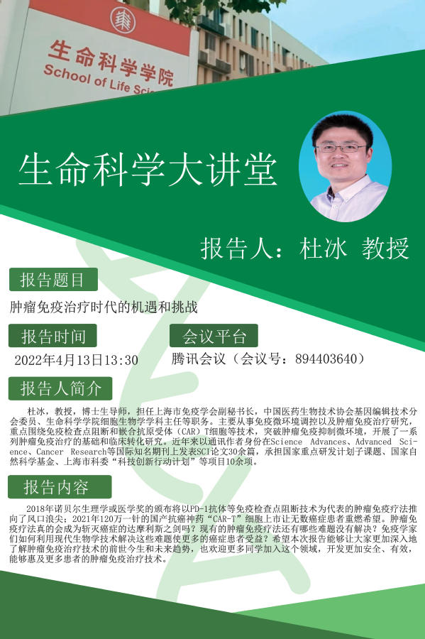 杜冰,教授,博士生导师,担任上海市免疫学会副秘书长,中国医药生物技术协会基因编辑技术分会委员、3200威尼斯vip细胞生物学学科主任等职务。主要从事免疫微环境调控以及肿瘤免疫治疗研究,重点围绕免疫检查点阻断和嵌合抗原受体(CAR)T细胞等技术,突破肿瘤免疫抑制微环境,开展了一系列肿瘤免疫治疗的基础和临床转化研究。近年来以通讯作者身份在Science Advances、Advanced Science、Cancer Research等国际知名期刊上发表SCI论文30余篇,承担国家重点研发计划子课题、国家自然科学基金、上海市科委“科技创新行动计划”等项目10余项。