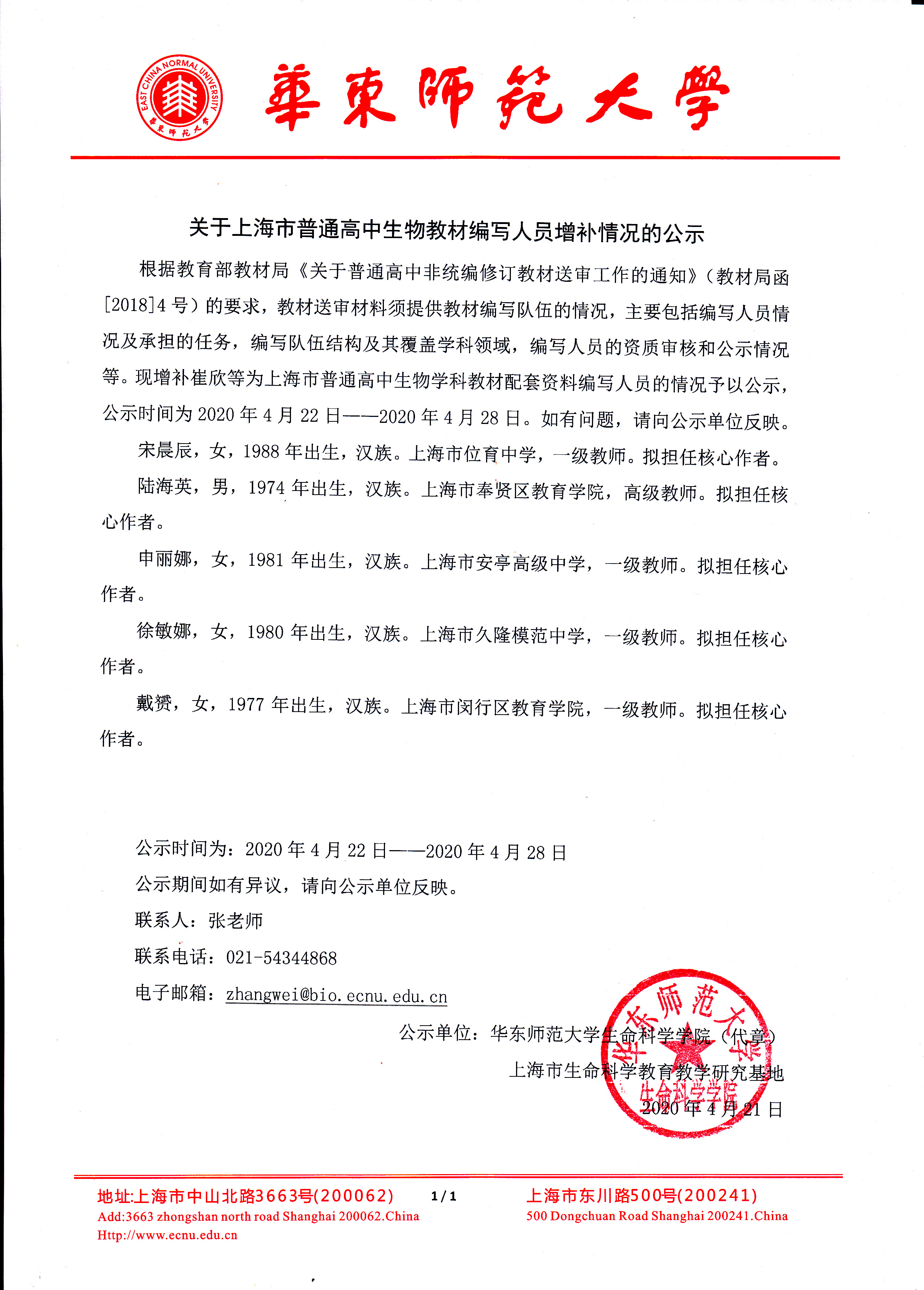 关于上海市普通高中生物教材配套资料编写人员增补情况的公示