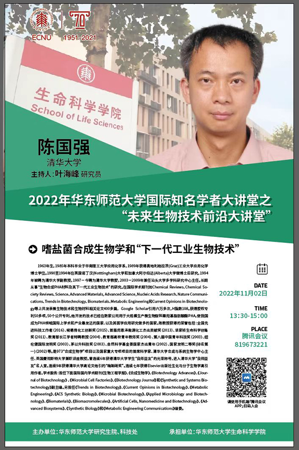 1963年生,1985年本科毕业于华南理工大学应用化学系,1989年获得奥地利格拉茨(Graz)工业大学应用化学博士学位。1990至1994年在英国诺丁汉(Notttingham)大学和加拿大阿尔伯达(Alberta)大学做博士后研究,1994年被聘为清华大学副教授,1997-今聘为清华大学教授,2003-2009年兼任汕头大学多学科研究中心主任。长期从事“生物合成PHA材料及其下一代工业生物技术”的研究。在国际学术期刊如Chemical Reviews、Chemical Society Reviews、Science、Advanced Materials, Advanced Science, Nucleic Acids Research、Nature Communications、Trends in Biotechnology、Biomaterials、Metabolic Engineering和Current Opinions in Biotechnology等上共发表微生物技术和生物材料相关论文400多篇, Google Scholar引用六万多次,H指数108。获得授权专利50多项,50个公开专利。他开发的技术已经在数家公司用于大规模生产微生物塑料聚羟基脂肪酸酯PHA,使我国成为PHA领域国际上学术和产业最发达的国家、以及其医学应用研究做多的国家。陈教授获得的荣誉包括:全国先进科技工作者(2016)、候德傍化工创新奖(2015)、首届闵恩泽能源化工杰出贡献奖(2013)、谈家祯生命科学创新奖(2011)、教育部长江学者特聘教授(2004)、教育部高校青年教师奖(2004)、第八届中国青年科技奖(2003)、纽伦堡国际发明奖(2003)、茅以升科技奖(2003)、自然科学基金委国家杰出青年(2002)、 国家发明二等奖(排名第一)(2002)等。是973“合成生物学”项目以及国家重大专项项目的首席科学家、清华大学合成与系统生物学中心主任、英国曼彻斯特大学兼职讲座教授。曾连续6年获得清华大学学生“良师益友”的光荣称号,进入清华大学“良师益友”名人堂。连续9年获得清华大学高论文他引的“梅贻琦奖”。连续七年获得Elsevier出版社生化与分子生物学高引用作者。学术服务:担任下面国际国内学术期刊《生物工程学报》、《合成生物学》、《Biotechnology Advances》、《Journal of Biotechnology》 、《Microbial Cell Factories》、《Biotechnology Journal》和《Synthetic and Systems Biotechnology》副主编。另担任《Trends in Biotechnology》、《Current Opinions in Biotechnology》、《Metabolic Engineering》、《ACS Synthetic Biology》、《Microbial Biotechnology》、《Applied Microbiology and Biotechnology》、《Biomaterials》、《Biomacromolecules》、《Artificial Cells, Nanomedicine and Biotechnology》、《Advanced Biosystems》、《Synthetic Biology》和《Metabolic Engineering Communications》编委