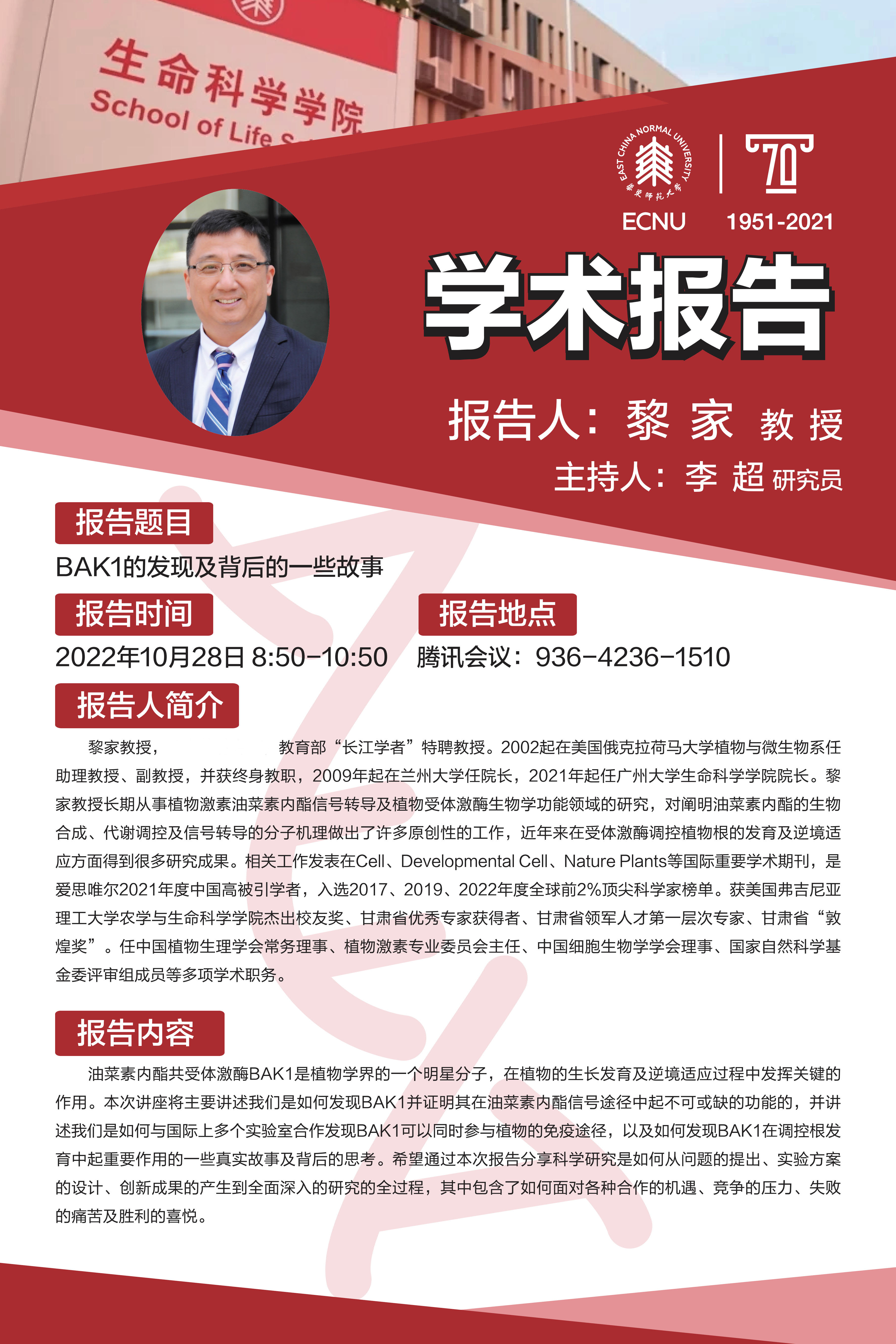 油菜素内酯共受体激酶BAK1是植物学界的一个明星分子,在植物的生长发育及逆境适应过程中发挥关键的作用。本次讲座将主要讲述我们是如何发现BAK1并证明其在油菜素内酯信号途径中起不可或缺的功能的,并讲述我们是如何与国际上多个实验室合作发现BAK1可以同时参与植物的免疫途径,以及如何发现BAK1在调控根发育中起重要作用的一些真实故事及背后的思考。希望通过本次报告分享科学研究是如何从问题的提出、实验方案的设计、创新成果的产生到全面深入的研究的全过程,其中包含了如何面对各种合作的机遇、竞争的压力、失败的痛苦及胜利的喜悦。