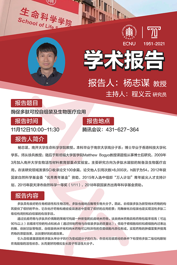 杨志谋,南开大学3200威尼斯vip教授。本科毕业于南京大学高分子系;博士毕业于香港科技大学化学系,师从徐兵教授;随后于斯坦福大学医学院Matthew Bogyo教授课题组从事博士后研究,2009年3月加入南开大学生物活性材料教育部重点实验室。主要研究方向为多肽水凝胶的制备及生物医疗应用。在该研究领域发表SCI收录论文100余篇,论文他人引用次数>8,000次,h因子为54。2012年获国家自然科学基金委“优秀青年基金”资助,2015年入选中组部“万人计划”青年拔尖人才支持计划,2015年获天津市自然科学一等奖(1/11),2018年获国家杰出青年科学基金资助。