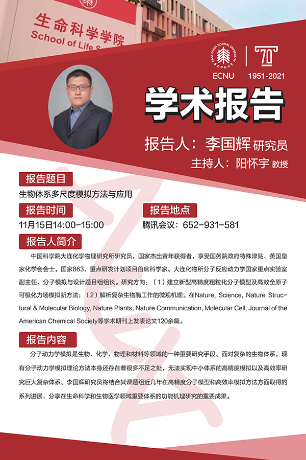 分子动力学模拟是生物、化学、物理和材料等领域的一种重要研究手段。面对复杂的生物体系,现有分子动力学模拟理论方法本身还存在着很多不足之处,无法实现中小体系的高精度模拟以及高效率研究巨大复杂体系。李国辉研究员将结合其课题组近几年在高精度分子模型和高效率模拟方法方面取得的系列进展,分享在生命科学和生物医学领域重要体系的功能机理研究的重要成果。