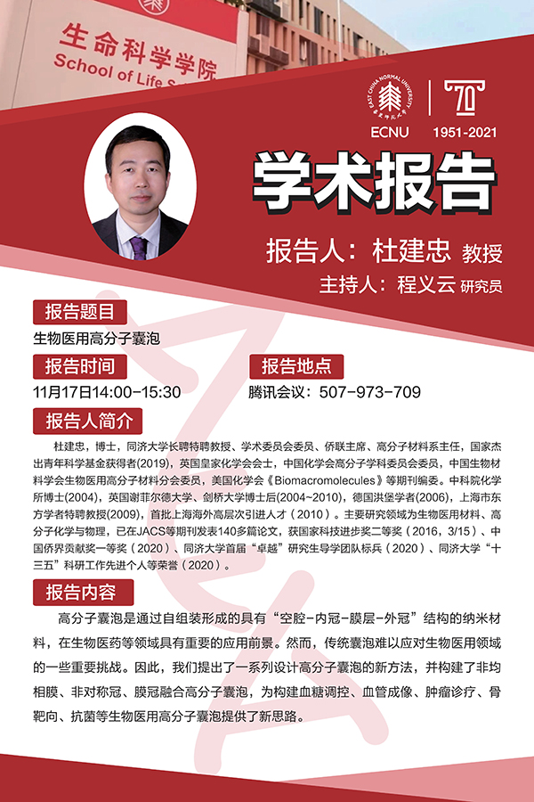 杜建忠,博士,同济大学长聘特聘教授、学术委员会委员、侨联主席、高分子材料系主任,国家杰出青年科学基金获得者(2019),英国皇家化学会会士,中国化学会高分子学科委员会委员,中国生物材料学会生物医用高分子材料分会委员,美国化学会《Biomacromolecules》等期刊编委。中科院化学所博士(2004),英国谢菲尔德大学、剑桥大学博士后(2004~2010),德国洪堡学者(2006),上海市东方学者特聘教授(2009),首批上海海外高层次引进人才(2010)。主要研究领域为生物医用材料、高分子化学与物理,已在JACS等期刊发表140多篇论文,获国家科技进步奖二等奖(2016,3/15)、中国侨界贡献奖一等奖(2020)、同济大学首届“卓越”研究生导学团队标兵(2020)、同济大学“十三五”科研工作先进个人等荣誉(2020)。