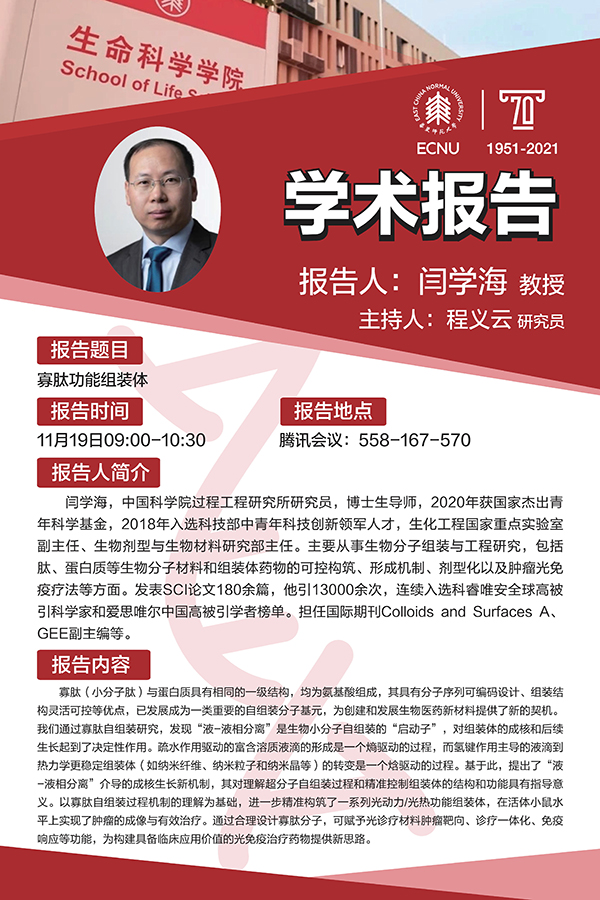 闫学海,中国科学院过程工程研究所研究员,博士生导师,2020年获国家杰出青年科学基金,2018年入选科技部中青年科技创新领军人才,生化工程国家重点实验室副主任、生物剂型与生物材料研究部主任。主要从事生物分子组装与工程研究,包括肽、蛋白质等生物分子材料和组装体药物的可控构筑、形成机制、剂型化以及肿瘤光免疫疗法等方面。发表SCI论文180余篇,他引13000余次,连续入选科睿唯安全球高被引科学家和爱思唯尔中国高被引学者榜单。担任国际期刊Colloids and Surfaces A、GEE副主编等。
