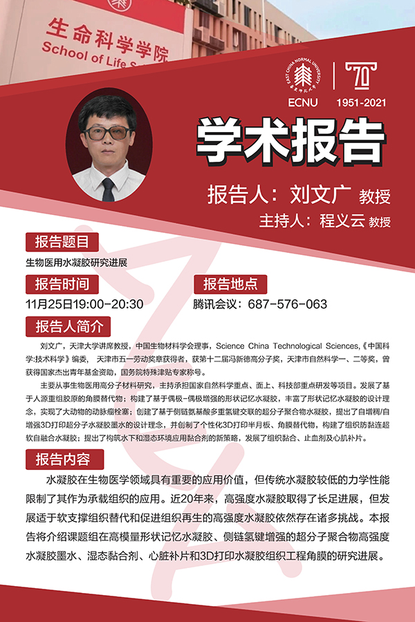 水凝胶在生物医学领域具有重要的应用价值,但传统水凝胶较低的力学性能限制了其作为承载组织的应用。近20年来,高强度水凝胶取得了长足进展,但发展适于软支撑组织替代和促进组织再生的高强度水凝胶依然存在诸多挑战。本报告将介绍课题组在高模量形状记忆水凝胶、侧链氢键增强的超分子聚合物高强度水凝胶墨水、湿态黏合剂、心脏补片和3D打印水凝胶组织工程角膜的研究进展。