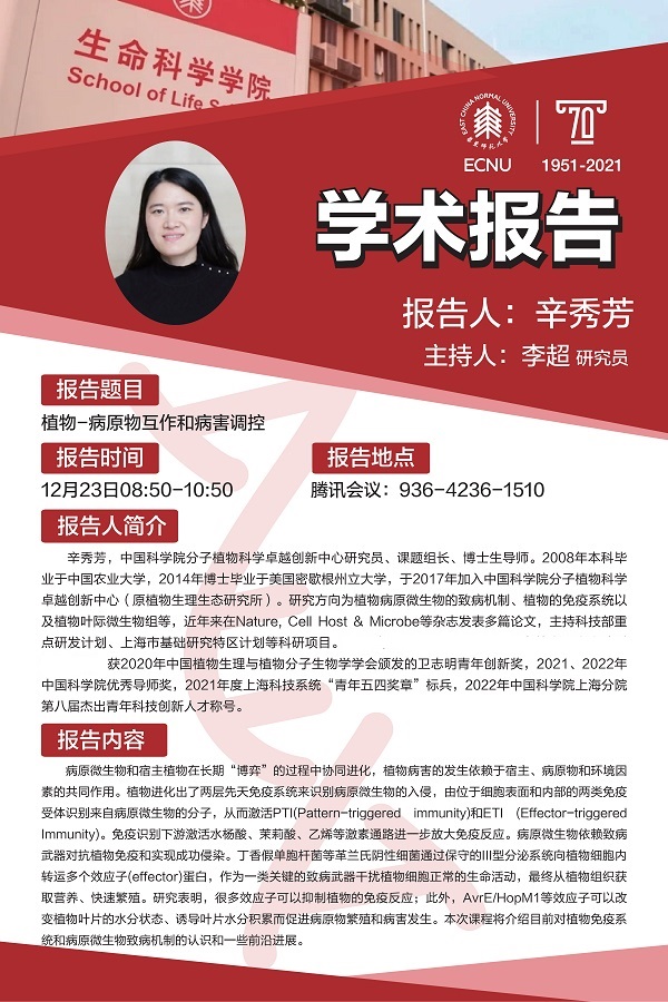 辛秀芳,中国科学院分子植物科学卓越创新中心研究员、课题组长、博士生导师。2008年本科毕业于中国农业大学,2014年博士毕业于美国密歇根州立大学,于2017年加入中国科学院分子植物科学卓越创新中心(原植物生理生态研究所)。研究方向为植物病原微生物的致病机制、植物的免疫系统以及植物叶际微生物组等,近年来在Nature, Cell Host & Microbe等杂志发表多篇论文,主持科技部重点研发计划、上海市基础研究特区计划等科研项目。获2020年中国植物生理与植物分子生物学学会颁发的卫志明青年创新奖,2021、2022年中国科学院优秀导师奖,2021年度上海科技系统“青年五四奖章”标兵,2022年中国科学院上海分院第八届杰出青年科技创新人才称号。