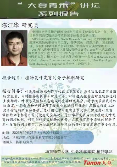 10月29日 陈江华:植物复叶发育的分子机制研究(3200威尼斯vip植物学科“大夏青禾”讲坛系列报告四)