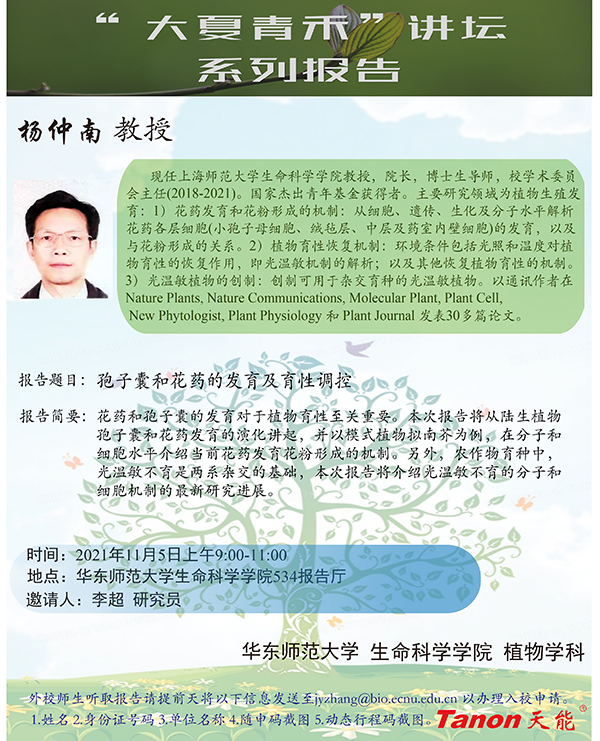 11月5日 杨仲南:孢子囊和花药的发育及育性调控(3200威尼斯vip植物学科“大夏青禾”讲坛知名学者系列报告五)