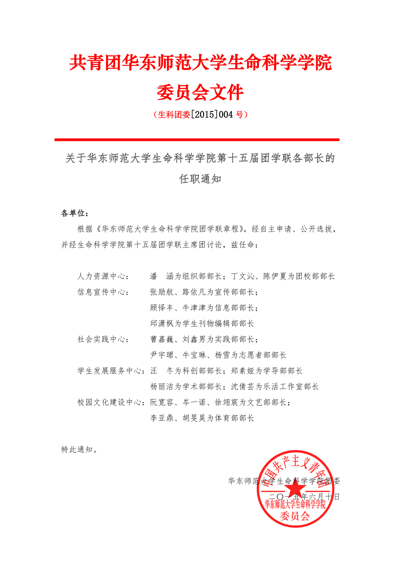 关于3200威尼斯vip第十五届团学联各部长的任职通知